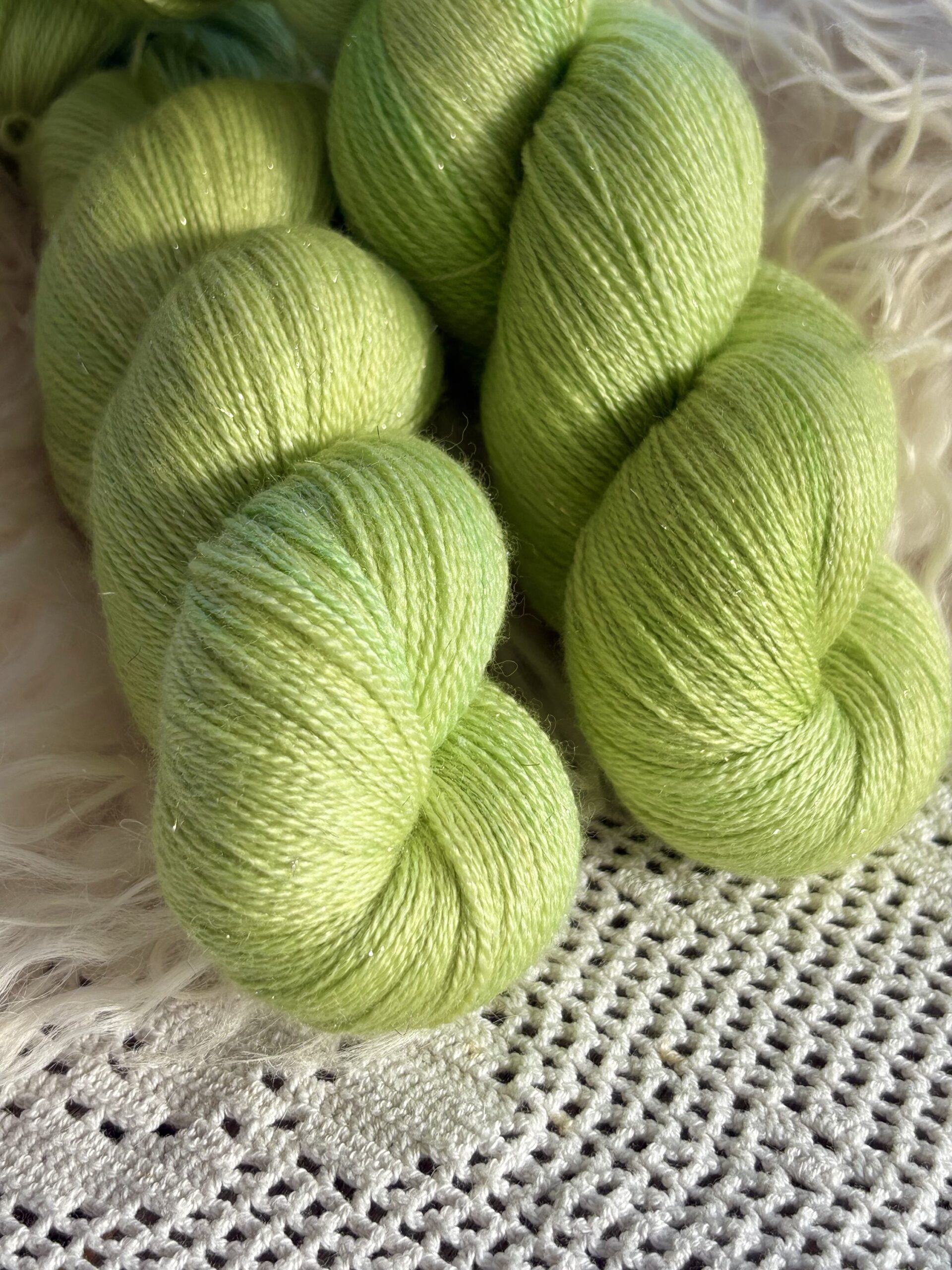 Handfärgat garn i spänstigt spunnen mjuk och härlig silke och merino, utmärkt till sjalar och tunna luftiga accessoarer med fin glittereffekt.