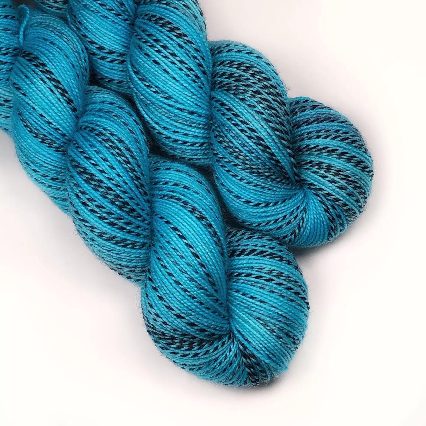 80% merino och 20% nylon. Fingering weight 2ply High twist, med en tråd naturligt svart.